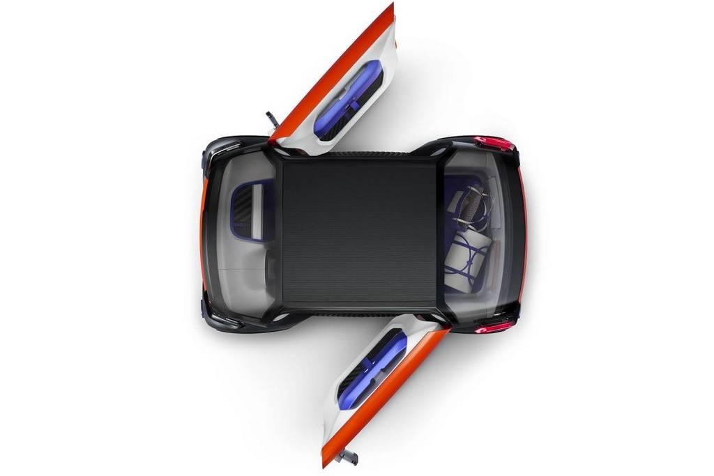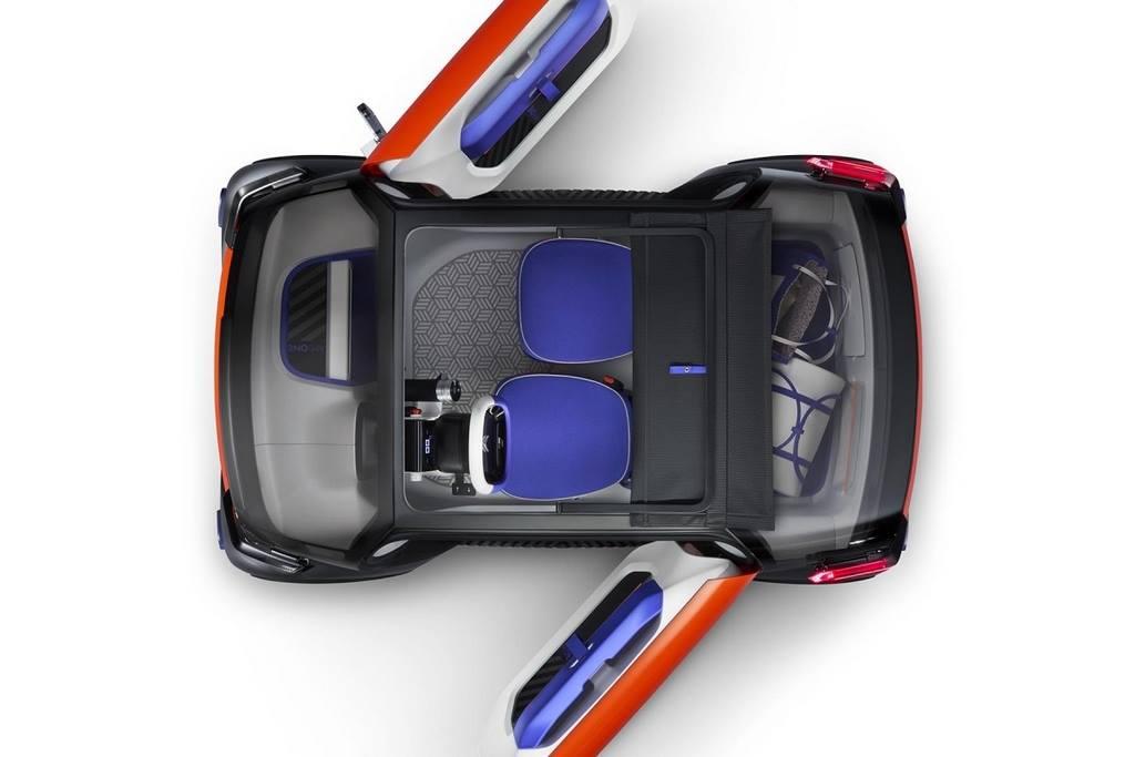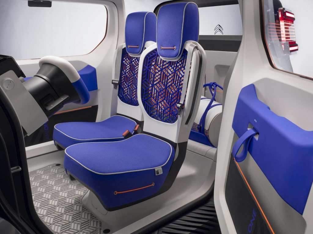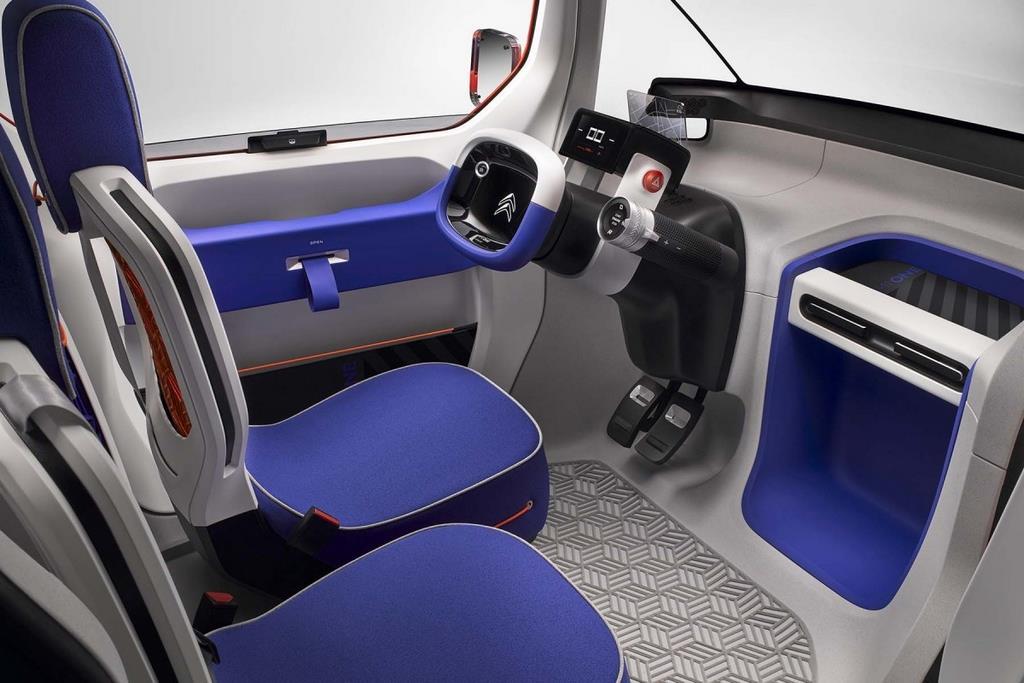 A l’intérieur, on reste dans le dépouillé avec deux places seulement, en décalé, avec une assise « pouf » des plus simple. Le concept est ouvertement tourné vers l’autopartage puisque tout semble prêt à être passé au jet d’eau, tapis de sol compris. La planche de bord est réduite à sa plus simple expression elle aussi avec un volant dont la colonne porte tout le nécessaire. Emplacement pour le smartphone, compteurs, bouton de « vitesse » (avant, neutre, arrière NDLA) et feux de détresse.