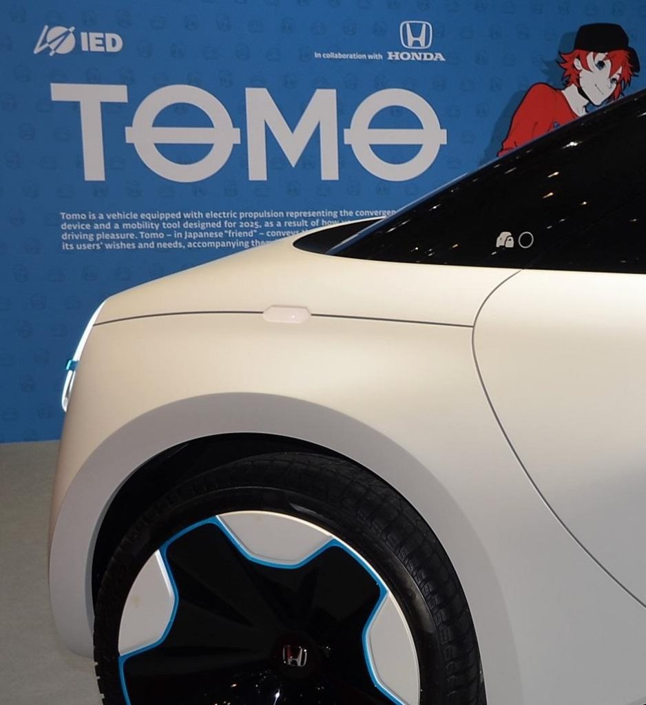 La Tomo est le résultat d’un travail mené par treize étudiants de l’IED de Turin. Le projet, réalisé avec l’assentiment de Honda, avait pour but d’imaginer un moyen de transport idéal, à la fois objet intelligent et outil de déplacement. Un fidèle compagnon au quotidien qui a logiquement pris le nom de « Tomo », pour « ami » ou « copain » en japonais. L’univers Manga a influencé les créateurs comme on peut le voir sur le stand d’IED. On imagine volontiers ce véhicule partiellement autonome, même si ces concepteurs n’en font pas cas, préférant parler de plaisir de conduire.