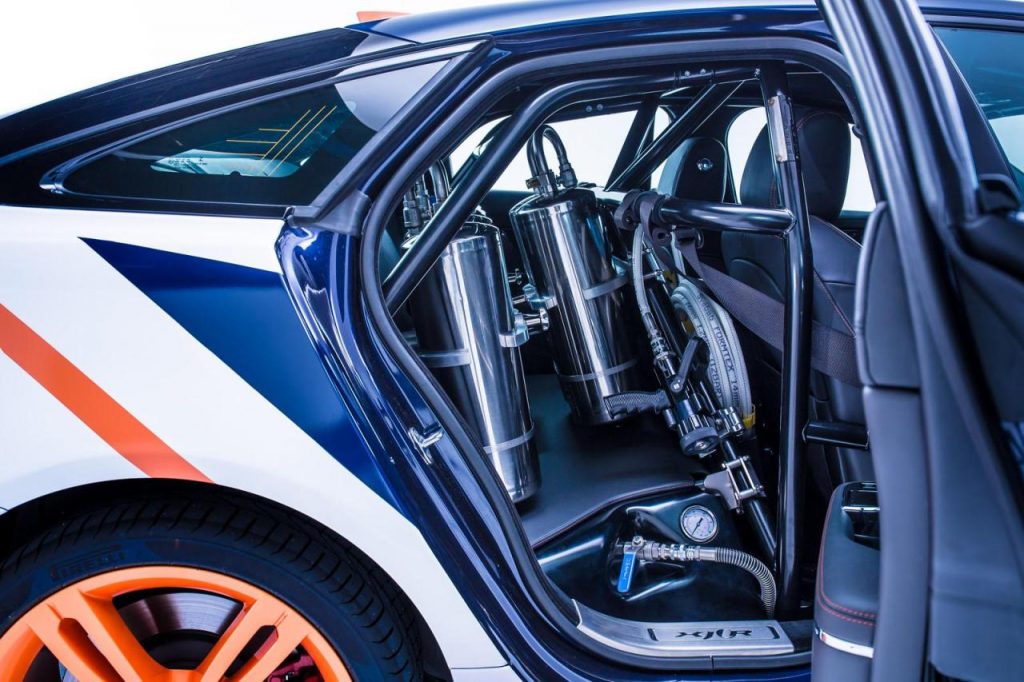 Cette XJR reprend les couleurs et la livrée du coupé F-Type R. Elle a été amputée de ces places à l’arrière et accueille un arceau de sécurité et différents équipements techniques afin d’assumer son rôle de véhicule d’assistance et d’intervention.