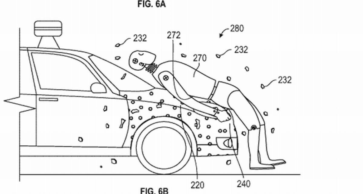 Aucune idée de la fonctionnalité plus concrète du dispositif si par exemple le piéton n’est pas précisément tapé de face ou jusqu’à quelle vitesse d’impact il resterait scotché au capot. Et si le piéton scotché obstrue le champ de vision ?