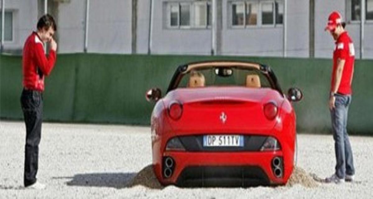 Non aucune allusion ne sera faite à un ex pilote de la Scuderia dont le prénom est Jean et le nom de famille Alesi. Le titre de ce billet suffit. Oubliez l’Avignonnais. Désormais quand on pensera bac à graviers chez Ferrari on fera plus directement allusion au big boss Luca di Montezemolo. En tout cas vu la scène Felipe Massa et Fernando Alonso ont franchement l’air de bien rire. Après la Veyron amphibie voici donc la Ferrari California « scotchée » dans du gravier.