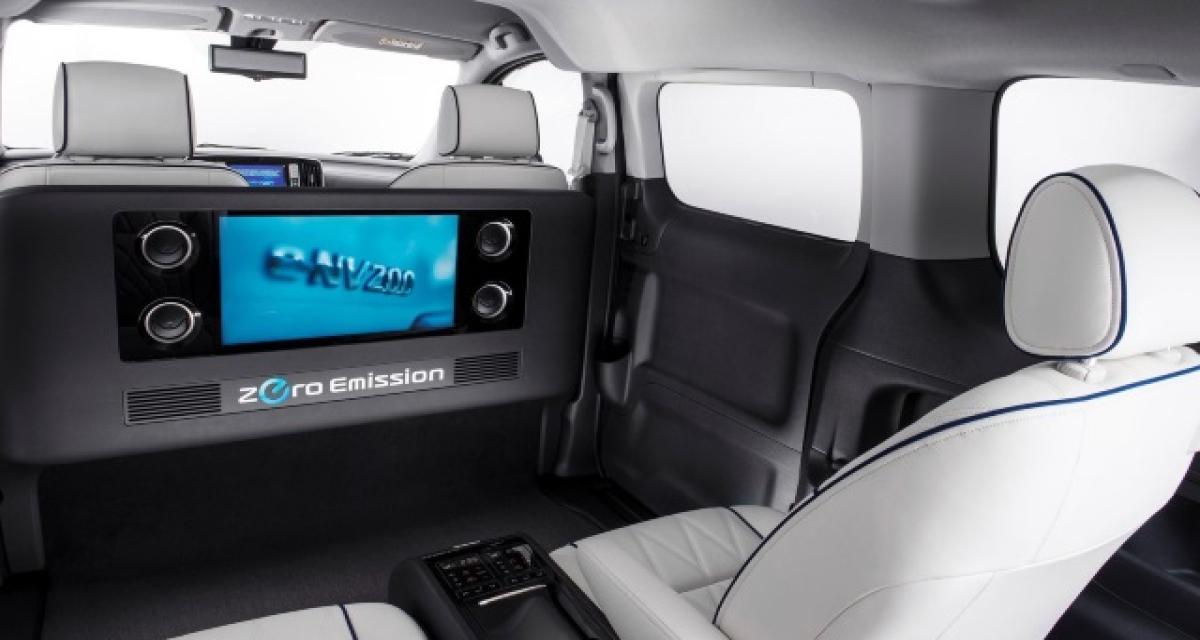 Ces fauteuils intègrent la ceinture, des accoudoirs et même des repose-pieds extensibles. Par rapport à l’Evalia, les fauteuils sont implantés plus en arrière. Cela grève un peu l’immense coffre mais cela permet d’avoir bien plus de place aux jambes et également de monter et descendre du véhicule de façon plus aisée. Les fauteuils sont recouverts de cuir beige clair rehaussé de liserés bleus. Une moquette épaisse noire tapisse le sol. Pour l’occasion, le e-NV200 se pare d’une peinture bi-ton bleu ciel et bleu foncé.