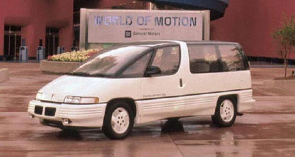 En 1986, GM propose un concept-car de monospace sportif et futuriste, le TransSport. Son design fuselé évoque en partie un hélicoptère, par sa bulle vitrée à l’avant. Le pavillon est entièrement vitré, à part la ceinture couleur caisse au niveau du montant central. L’accès à bord s’opère pour les passagers arrière via une unique porte papillon. A l’intérieur, la poste de pilotage est lui aussi futuriste, avec ses boutons au centre du volant, son instrumentation constituée par un écran à tube cathodique, son affichage tête haute, son écran avec détection des obstacles pour remplacer le rétroviseur ou encore son ordinateur installé dans un tiroir face au passager, avec fonctions de communications comparables à ce qu’offre aujourd’hui OnStar. Sous le capot, le V6 2.9 est dopé par un turbo et développe 235 ch.