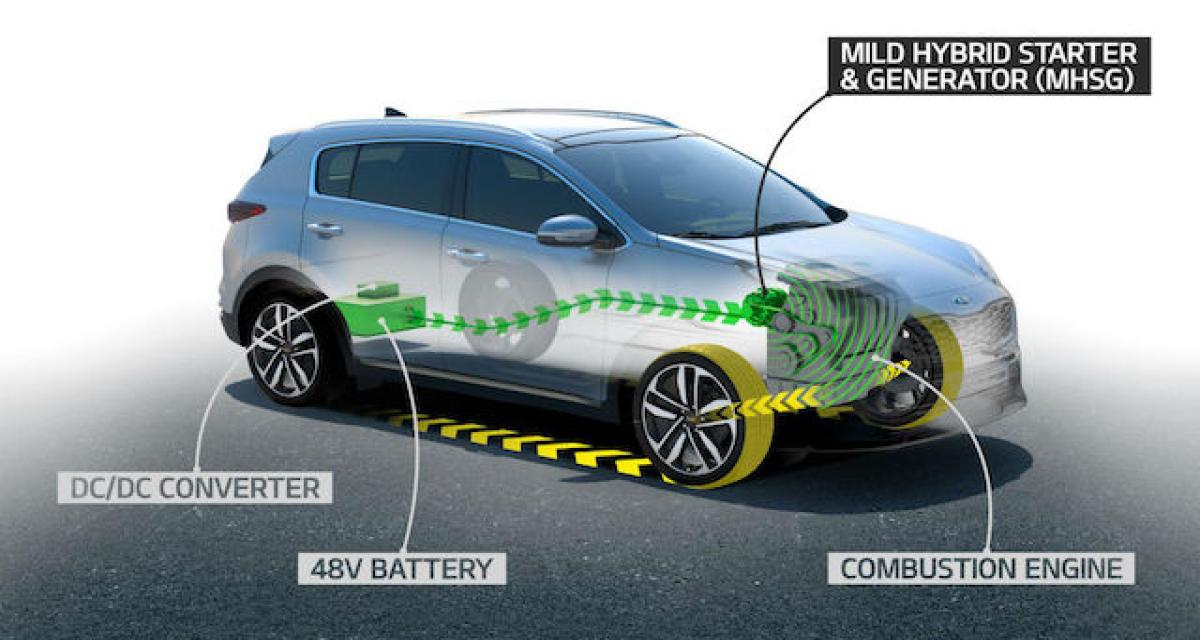 Lors de phases d’accélérations, le système « mild hybrid » fournit une assistance électrique pouvant aller jusqu’à 10 kW/14 ch et peut également récupérer l’énergie lors des phases de freinage et de décélération, afin de recharger les batteries. Kia annonce une réduction de la consommation et d’émissions de CO2 de 7 % en cycle NEDC et 4 % en cycle WLTP.