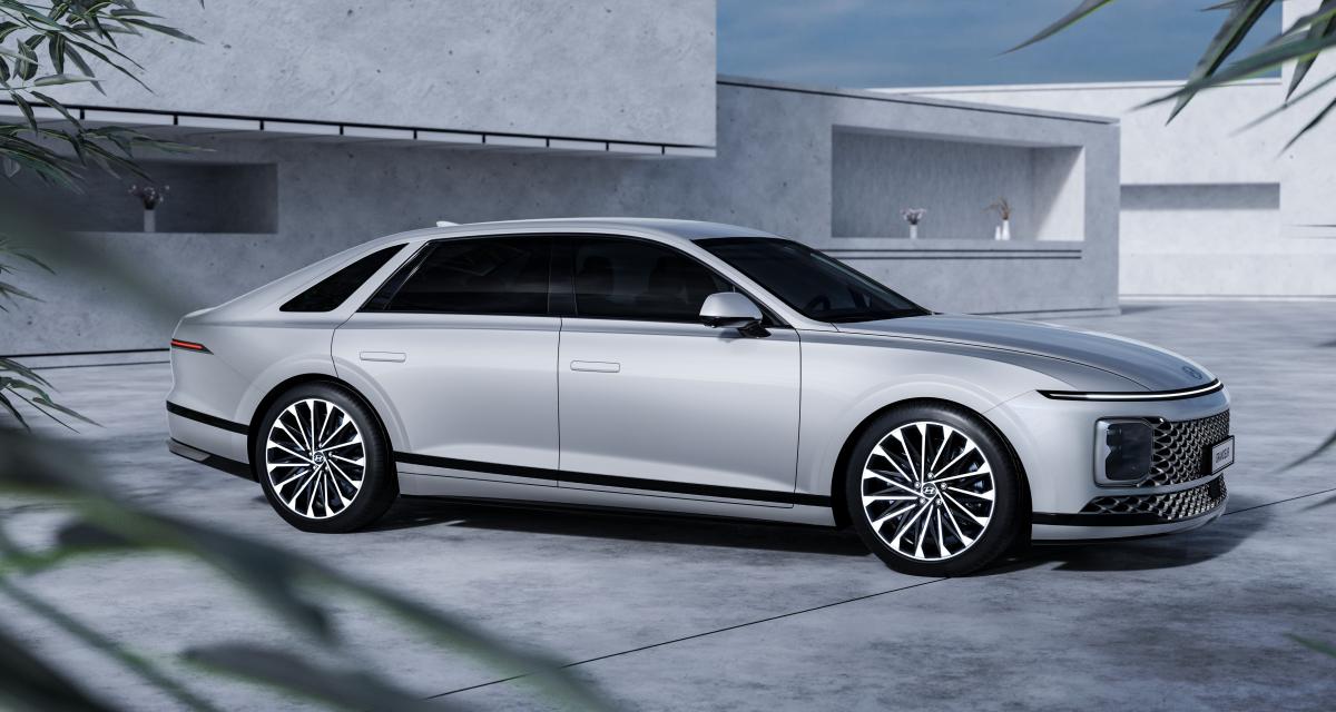 Les concepteurs de Hyundai ont intégré des poignées de porte affleurantes, des jantes en alliage de 20 pouces et une référence au passé, essentiellement avec les montants C couleur carrosserie et la vitre latérale arrière triangulaire qui font écho à la Grandeur de première génération des années 80. Alors que Hyundai est fier de l'héritage de la berline, il faut noter que la Grandeur d'origine était une Mitsubishi Debonair de deuxième génération rebadgée (1986-1992).