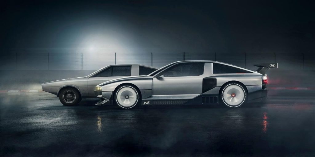 Le second concept pourrait parfaitement illustrer le design Retrowave qui est très tendance en ce moment. Sorte de croisement entre une Muscle car, une Ioniq 5 et une DeLorean des années 80, elle rend hommage au concept Hyundai Pony Coupé de 1974, qui a été développé par le légendaire designer automobile Giorgetto Giugiaro. La N Vision 74 reprend les lignes anguleuses et tendues, qui sentent bon les années 70-80, en y ajoutant la touche futuriste avec les optiques à éclairage Parametric Pixel. L'ensemble a vraiment de la "gueule" avec sa face avant intimidante façon Chevy Camaro, le large montant central, les roues pleines, les énormes prises d'air, le spoiler arrière énorme et des formes à la fois musclées, acérées et rétro-futuristes. De profil, on pourrait même y voir une parfaite réinterprétation de l'Audi Sport Quattro !
