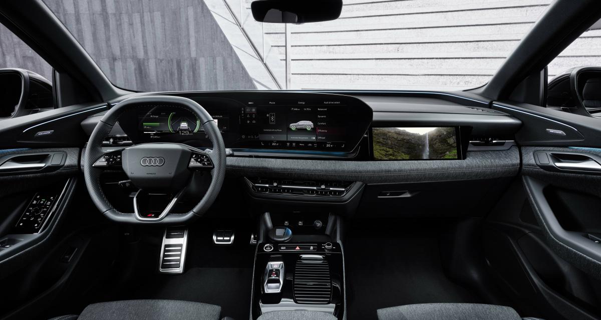 Selon la présentation faite par Audi, le design global de l’habitacle a pour vocation de réunir les éléments de l’habitacle comme un seul espace unifié et homogène, donnant l’impression d’un « cocon douillet ». Oui, Audi parle de concon douillet maintenant, oubliez les discours virils sur les gros moteurs et le Quattro d’antan. Cette approche se matérialise par la présence du « Softwrap », une zone intermédiaire transversale qui s’étend des portes à la console centrale en passant par l’ensemble du cockpit, créant ainsi une sensation d’espace homogène et accueillant. Les couleurs et les matériaux de haute qualité, pour certains fabriqués à partir de matériaux recyclés, sont également utilisés pour les sièges. Les zones qui mettent l’accent sur le confort se distinguent par leurs grandes surfaces et leurs matériaux souples. Les zones d’utilisation, conçues avec précision, sont habillées d’un noir brillant afin d’offrir la clarté nécessaire à l’interaction avec le véhicule.