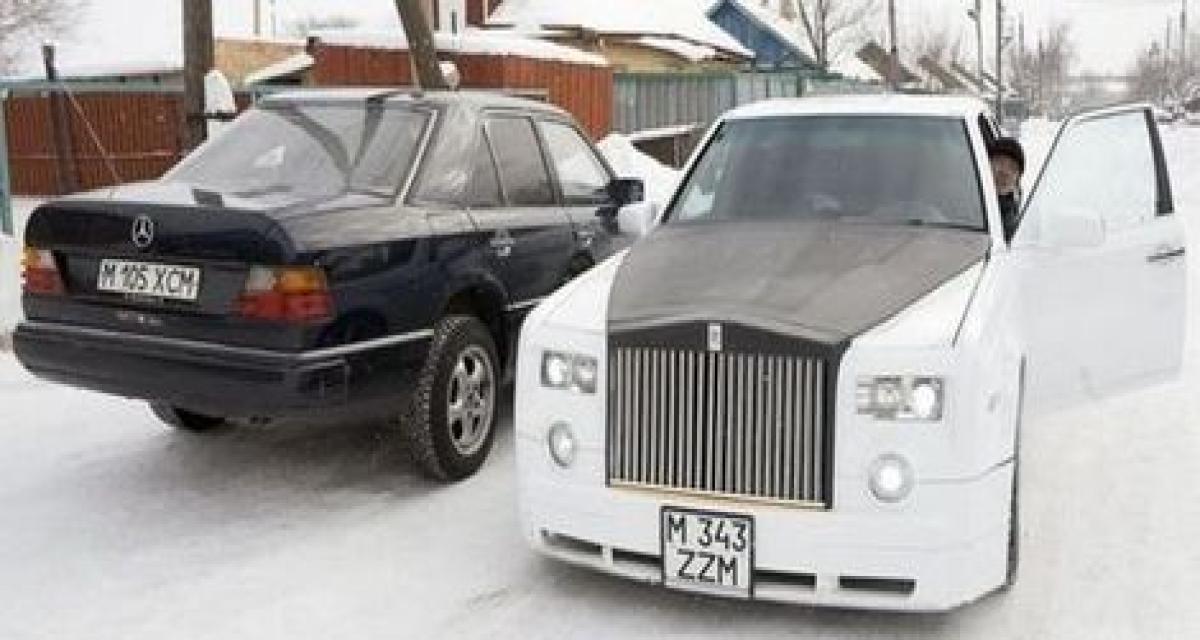 La scène se déroule donc au Kazakhstan ou le propriétaire d’une ancienne Classe E de 1991, monsieur Ruslan Mukanov (24 ans et mécanicien dans le civil) a tout bonnement décidé de construire un kit carrosserie en fibre de verre pour donner à sa routière allemande le look d’une Rolls-Royce Phantom. De l’art de passer d’une « roturière » à une exclusivité. Enfin presque.