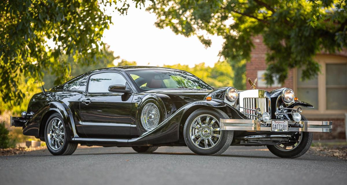 Zimmer a introduit le chrome, les ailes énormes et sinueuses, les faux pots d'échappement, un système audio Shaker, une nouvelle sellerie en cuir rouge sur le volant et les panneaux de porte ainsi que les deux roues de secours appliquées sur les côtés de la carrosserie. Le logement de la troisième roue de secours sur le capot arrière est en fait un faux et la vraie roue de secours se trouve à l'intérieur, sous le plancher de chargement. L’assemblage ressemble à une greffe étrange, avec une coque de Mustang moderne posée sur une partie avant dont la calandre s’inspire vaguement inspirée de la devanture du Parthénon (comme sur les Rolls Royce d'antan) avec une frise kitsh ornée d'un immense aigle royal sur le capot. Vous remarquerez aussi que sur la plaque est inscrit Gattsby (avec deux T, tiens donc), en référence évidemment à ce célèbre personnage de roman, Gatsby le magnifique, milliardaire des années folles.