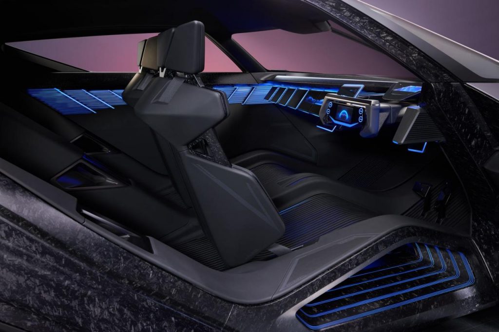 La batterie est une batterie tout état solide. Le Graal de la batterie qu'on nous promet depuis…trop longtemps. On est dans le concept donc on peut se permettre de parler de masses parfaitement réparties, d'une puissance de 1000 kW (les fameuses Megacars de 1 MW de puissance thermique tremblent). La voiture a une transmission intégrale e-4ORCE. En gros l'électronique contrôle le couple envoyé à chaque roue pour maximiser la traction au sol.