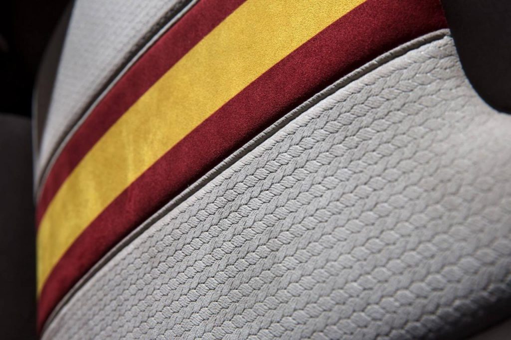 Cuir et Alcantara concluent le traitement dévolu à l’intérieur. Pourquoi le choix du rouge et du jaune ? Comme les deux couleurs majoritaires de l’emblème du club.
