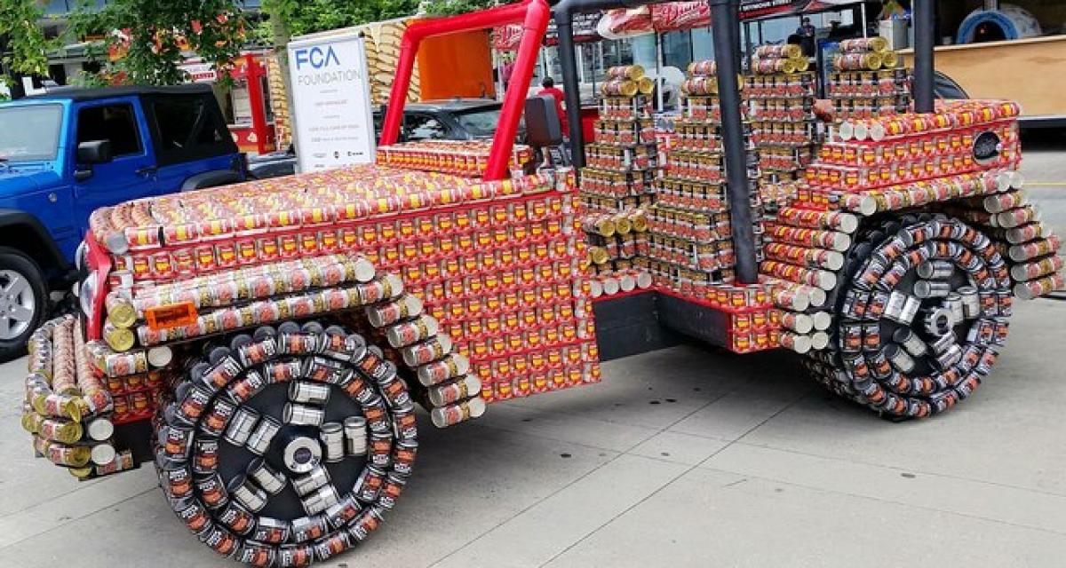 Cette boîte de conserve quasi roulante a été réalisée suite à une action conjointement menée par l’antenne canadienne de FCA, la fondation FCA et l’organisme caritatif Canstruction.