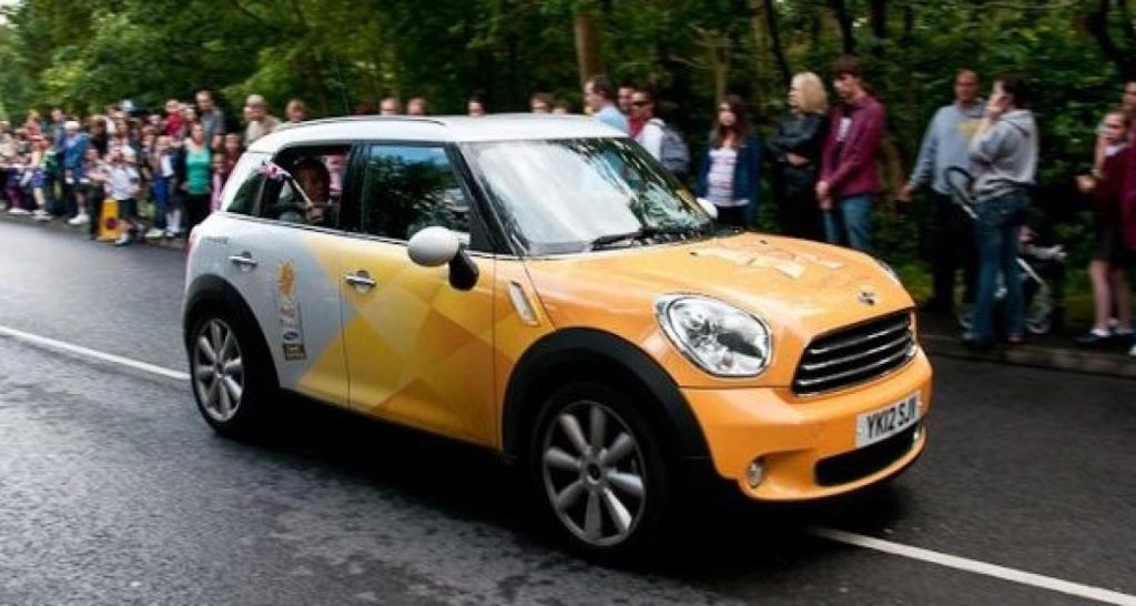 En Grande-Bretagne, le porteur de la flamme est suivi par des Countryman et Clubman aux couleurs des sponsors: