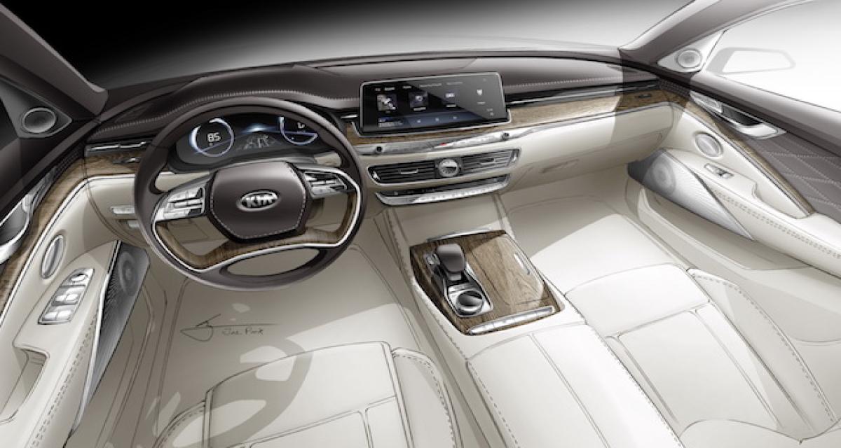 L’esquisse révèle une planche de bord au dessin qui n’est pas sans rappeler certains modèles de Munich. La Kia K900 se singularise par un volant à quatre branches au dessin tarabiscoté. L’habitacle se pare de cuir clair pour la sellerie et la partie inférieure ainsi que de cuir sombre pour la partie supérieure.