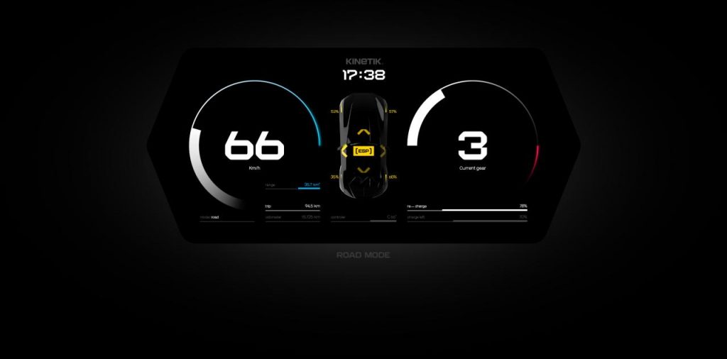 Avec ce procédé, Kinetik souligne aussi que toutes les parties de la voiture sont personnalisables, carrosserie comprise. Les passionnés peuvent commander une version radicale « Track » ou commander une version plus confortable et mieux équipée qu’ils peuvent conduire à travers l’Europe. Le tableau de bord numérique est configurable par le conducteur avec la possibilité de télécharger une carte de la piste sur laquelle ils conduisent, un système de télémétrie complet et la possibilité d’activer un mode de coaching qui les aide à maximiser leur autonomie.