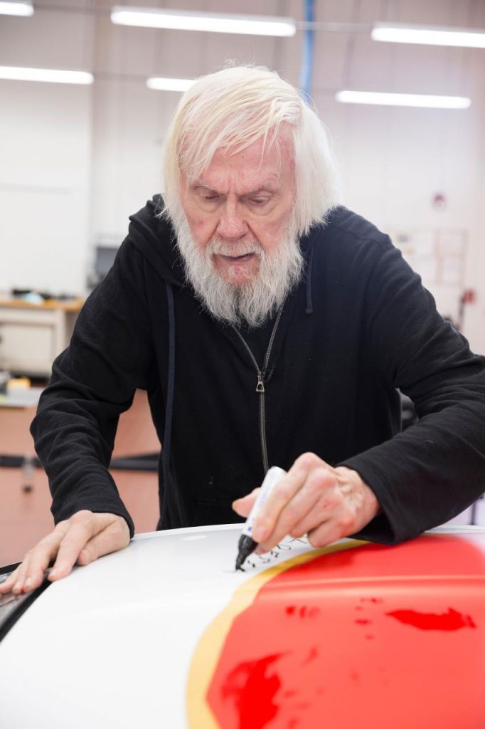 Celle présentée ce jour est officiellement la 19ème de la série. Ceci alors que la 18ème créée par l’artiste chinoise Cao Fei sera en fait présentée à l’été 2017. Cette 19ème Art Car donc, est signée John Baldessari. L’artiste américain est surtout connu pour ses œuvres réalisées à partir de photographies, photos montages ou photos recoloriées à base de couleurs vives. Et en particulier des œuvres sur lesquels les visages sont recouvert d’un disque coloré.