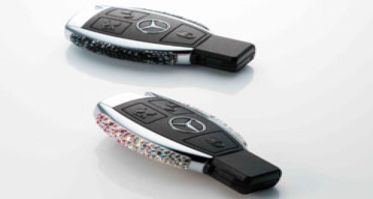 La clé de base Mercedes se présente de façon chromée. Passée entre les mains de Swarovski, ses flancs sont ornés 200 éléments brillants, proposés au choix en rose ou en noir. Dans une première phase, ce sont les clients japonais qui auront la primeur de cette option, créée plus spécifiquement pour leurs goûts. Affichée à 367 euros, elle sera disponible à 800 exemplaires.