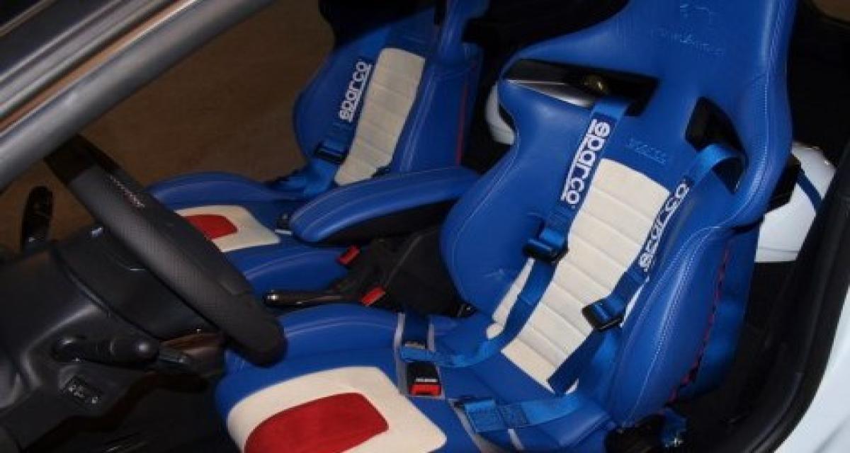 Le moins que l’on puisse dire est que pour une préparation italienne cette DS3 Ecurie met bien en avant les trois couleurs de notre drapeau national que ce soit -à l’extérieur- au niveau du pare-choc avant, les coques de rétroviseurs, la malle arrière ou même le toit. Mais le morceau de choix reste l’intérieur. Stricte deux places, cette DS3 Racing se voit allégée de sa banquette arrière, remplacée (avantageusement?) par 2 casques et un extincteur. Le pilote et son copilote s’installeront dans des baquets Sparco en cuir bleu blanc rouge coordonnés avec le pédalier lui aussi tricolore ou les garnitures de portes en cuir bleu.