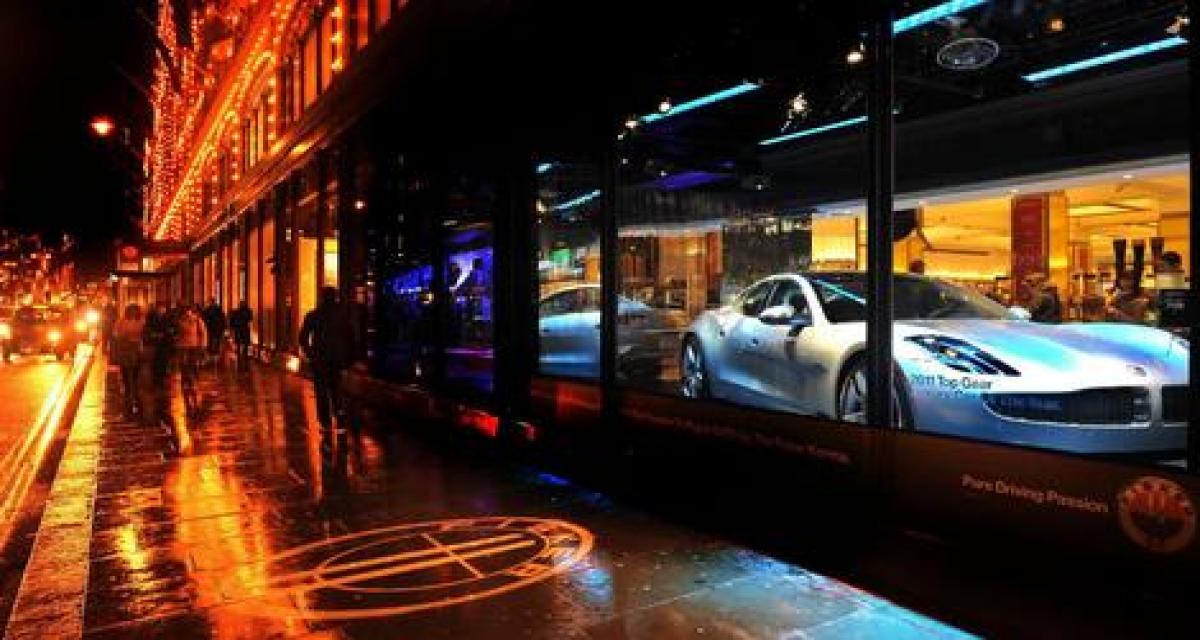 L’exposition de la Fisker Karma dans la vitrine de ce magasin Harrods se tiendra jusqu’au 4 février prochain alors même que, comme en France, les soldes d’hiver battent leur plein outre-Manche.