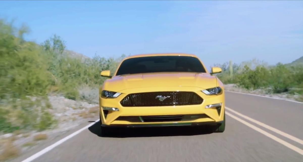 Dévoilée sur cette vidéo dans la finition GT 5.0 avec le package de performance, cette Mustang, cru 2018, arbore une face avant légèrement retouchée. Le bouclier a été redessiné dans sa partie inférieure avec une traverse amincie, une bouche d’aération entourée par l’apparition de deux découpes triangulaires. La forme des phares évolue très légèrement avec maintenant avec une légère découpe dans la partie inférieure. Enfin, le capot voit ses bosses aplaties. Ces légères retouches confèrent néanmoins à la Mustang reliftée une agressivité renforcée. L’arrière évolue également avec feux arrière à trois barrettes verticales désormais arrondies.
