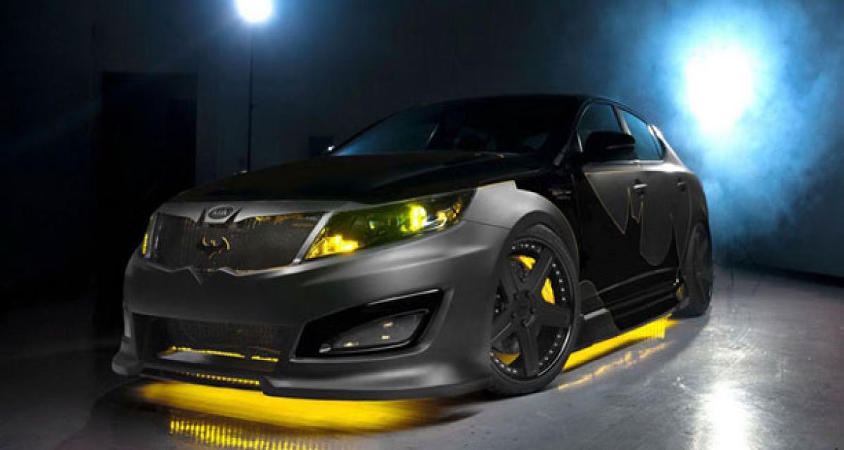 Le partenariat d’une durée de 10 mois verra donc naître 8 véhicules Kia déclinés sur le thème des super-héros de Comics. Batman débute la série, avec l’Optima, bien entendu toute de noir (mat et brillant) vêtue. Les feux de jour à LED passent au jaune, autre couleur thématique de la série, que l’on retrouve pour un peu discret (Batman et les autres super héros le sont rarement) éclairage sous châssis, ou encore pour les coutures contrastées de la sellerie. Bien entendu, les optiques projettent le célèbre logo, et la calandre se transforme elle-même en évocation de la chauve-souris…