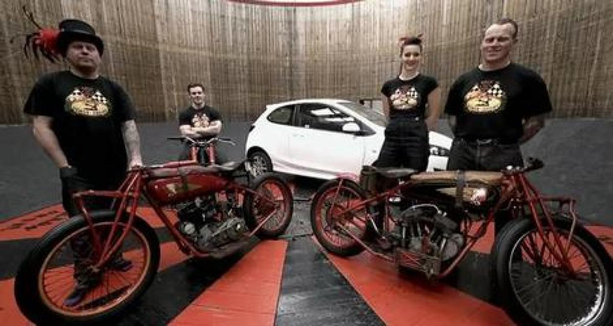 Outre les traditionnelles motos d’ordinaire dévolues à ce genre d’exercice impressionnant, c’est une Mazda2 qui s’est collée au mur de la mort alias wall of death (ou vice-versa). Pour s’aligner au cœur de la cage, la Japonaise avait quand même reçu quelques petites modifications.