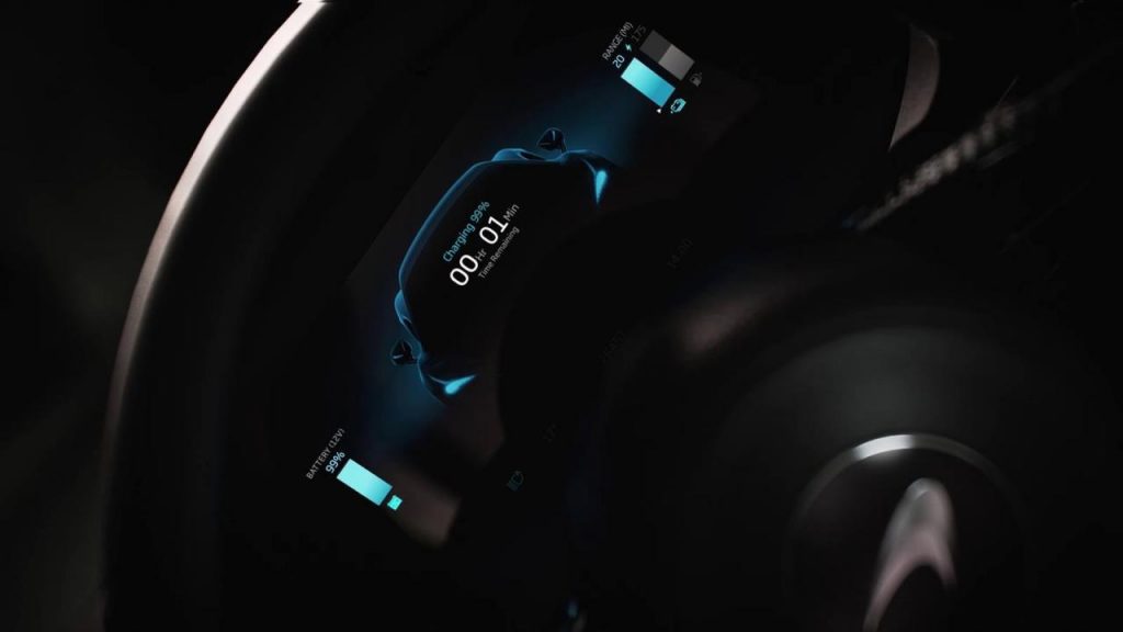 Durant le teaser, McLaren laisse entrevoir le combiné d’instruments. Celui-ci affiche une batterie 12 volts chargée à 99% et qui donnerait 20 miles d’autonomie électrique. 32 km en pur électrique donc si on en croit ce qui est « teasé ». En revanche, le « 12V » semble incongru. En effet, c’est plutôt une tension de micro-hybride, plus que de plugin hybrid (ou hybride rechargeable).