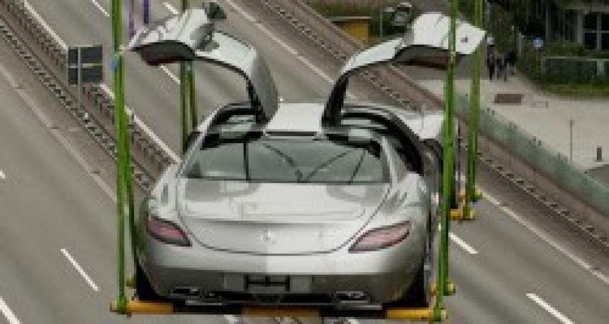 Nouvelle méthode de communication autour de la Mercedes SLS AMG que la hisser à plus d’une quarantaine de mètres de hauteur pour la garer sur la terrasse du musée Mercedes de Stuttgart. Transportée par un grue et solidement harnachée, elle a déployé ses ailes de mouette lors de son ascension.
