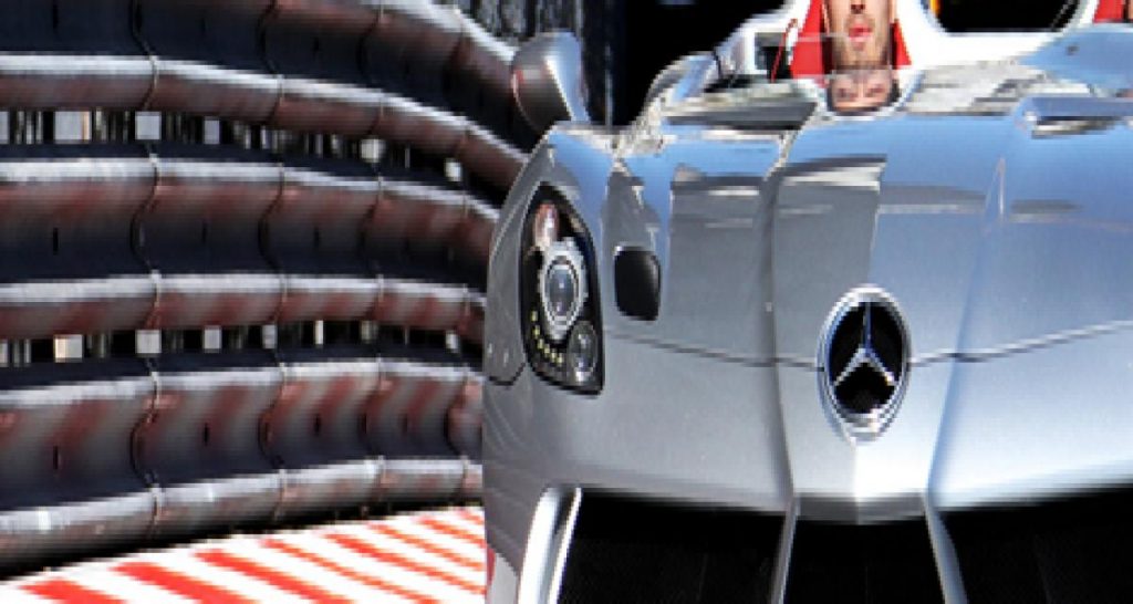 Durant le salon Top Marques Monaco, les quelques exposants disposaient d’un exemplaire prêt a fouler la piste de Formule 1 pour impressionner le futur client venu se fournir dans ce magasin de jouets de luxe. Et après les courses certains s’offraient une ballade cheveux au vent dans les rues monégasques comme ici, en Mercedes McLaren SLR Stirling Moss. La claque de la semaine ? Assurément lorsque l’on sait que l’engin a été tiré à 75 exemplaires à 750.000€ pièce !