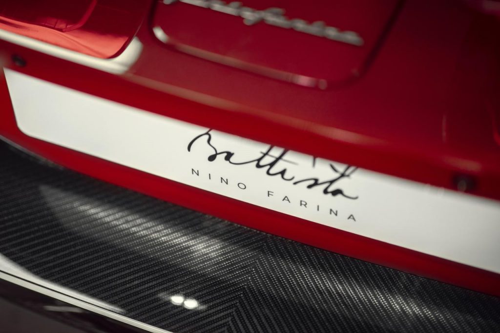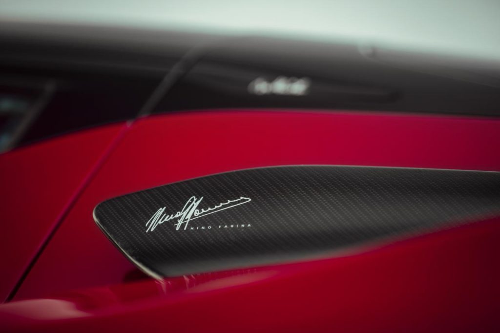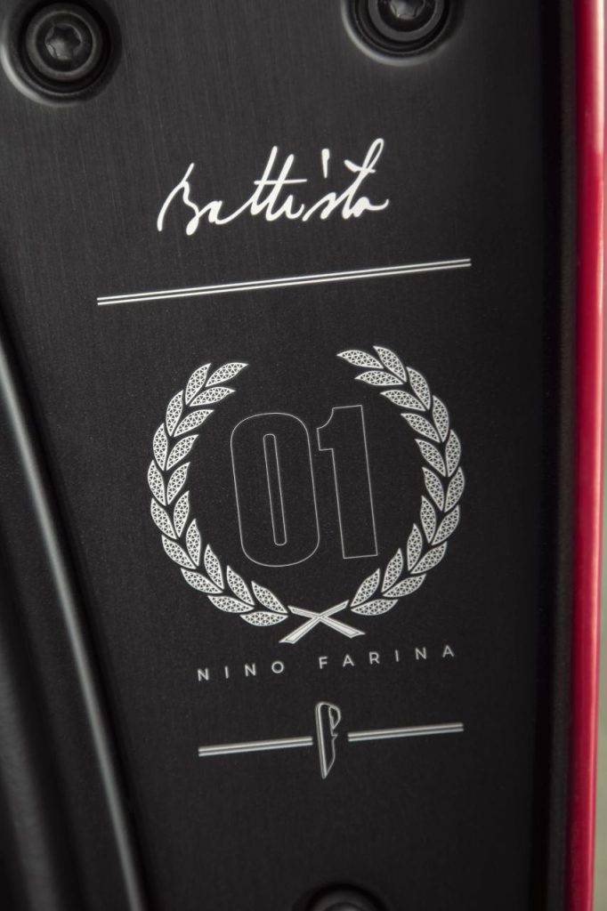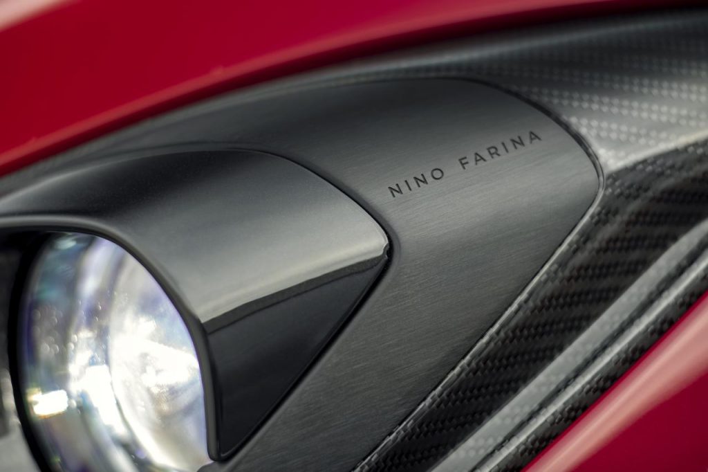 De subtils détails extérieurs faisant référence à Nino Farina sont visibles à travers le véhicule. Une gravure sur mesure « Nino Farina » sur l'unité de phare est finie en aluminium brossé anodisé en noir, tandis que l'aile latérale en carbone côté conducteur est rehaussée d'une signature graphique « Nino Farina ».