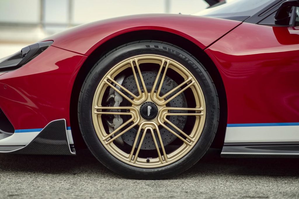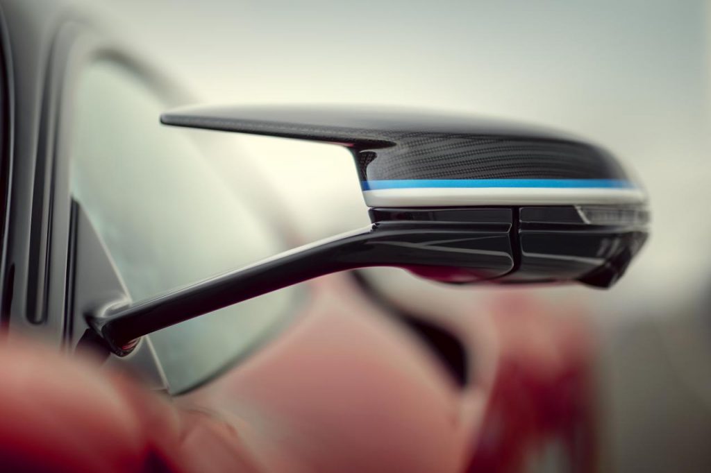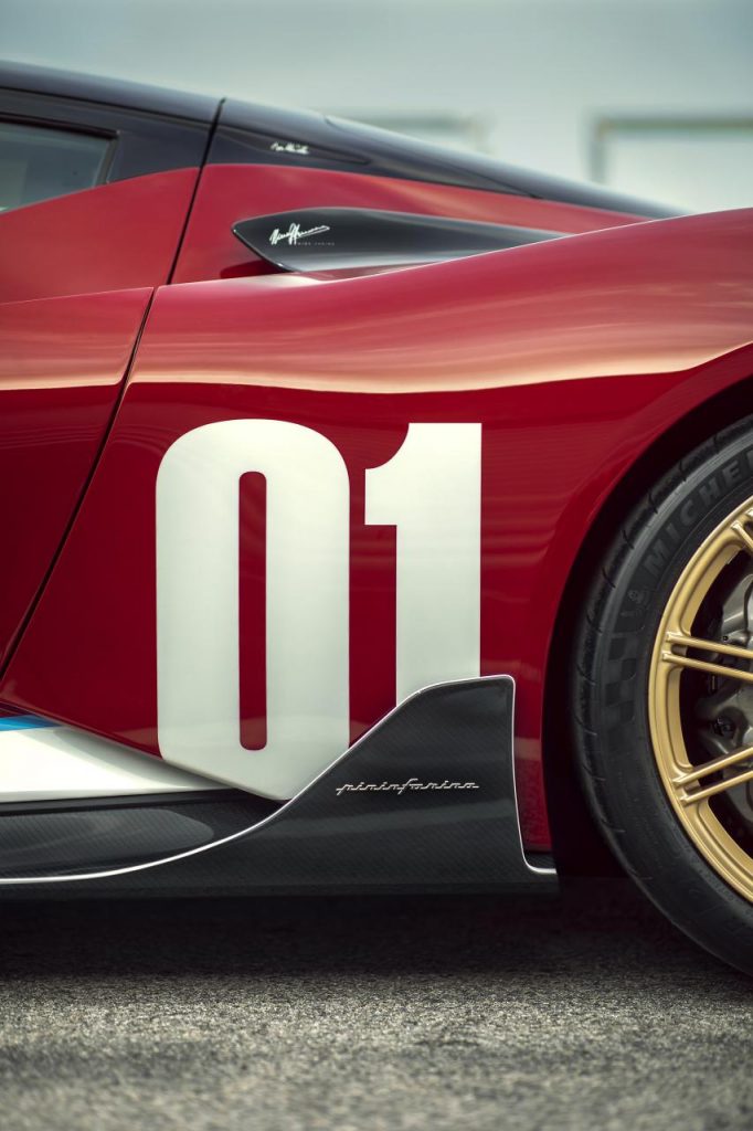 Le design extérieur est présenté dans une teinte rouge « Rosso Nino » qui rend hommage aux livrées des monoplaces de course italiennes de l’épique. La carrosserie complexe et la peinture Rosso Nino sont complétées par une livrée spéciale sur le bas de la carrosserie, finie en Bianco Sestriere et Iconica Blu.