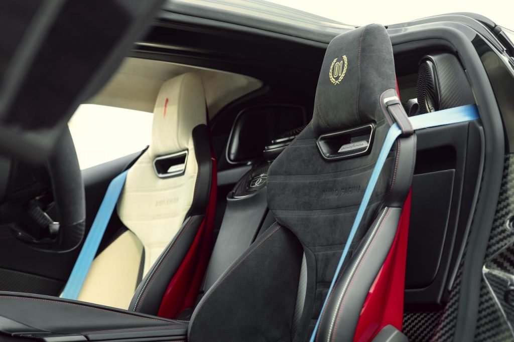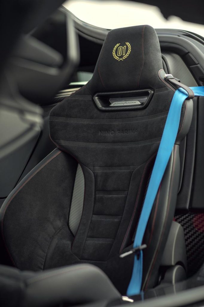 A l’intérieur, le conducteur posera son séant sur du cuir alors que le passager le fera sur de l’Alcantara. Les sièges Pilota présentent un design unique entre le conducteur et le passager, tous deux avec un motif matelassé sur mesure et « Nino Farina » sur le dossier. Sur le siège conducteur noir, l'appui-tête présente une couronne de laurier brodée et un graphisme « 01 » en or, tandis que le logo Pininfarina est fini en rouge sur le siège passager beige. Les dossiers des deux sièges sont peints en Rosso Nino, assorti à la carrosserie extérieure.