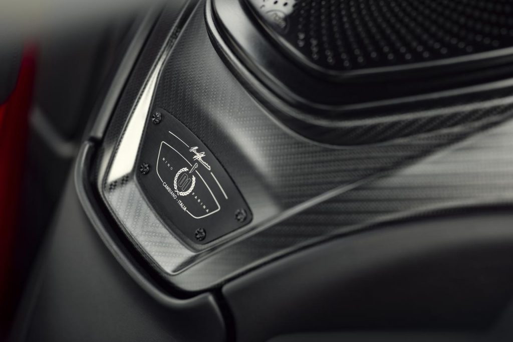 Suivant le thème extérieur, la sellerie est accentuée par les ceintures de sécurité Iconica Blu, avec une surpiqûre contrastée bicolore beige et rouge sur le tunnel central, le tableau de bord et les sièges. Le volant est fini en Alcantara noir avec carbone exposé, avec un anneau contrastant à 12 heures en aluminium brossé anodisé en rouge. L'attention portée aux détails s'étend à la plaque de volant, qui est finie en aluminium brossé, anodisé noir, portant la signature "Nino Farina". Comme à l'extérieur, les détails sombres se prolongent à l'intérieur avec le Pack Bijoux Intérieur en aluminium brossé anodisé noir.