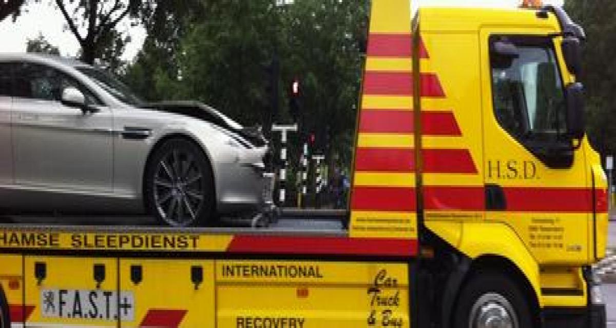 Et voilà ce qui semble bien se présenter comme la première Aston Martin Rapide au tas. Pas grand chose de plus à signaler en complément de quelques photographies hormis le fait que l’accident semble s’être déroulé à Eindhoven, ville située dans le sud des Pays-Bas (mais camion de transport visiblement belge). Trop véloce la Rapide ?!