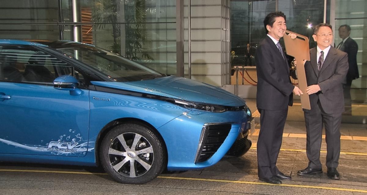 Après avoir passé la barre des 1 500 commandes au Japon, la première Toyota Mirai vient d’être livrée à son propriétaire par le président de Toyota Motor Corporation, Akio Toyoda. L’heureux élu n’est autre que le premier ministre japonais en personne, Shinzo Abe. Toyoda n’a pas caché son enthousiasme: « C’est un moment historique et je suis vraiment excité. Ce sera un long parcours et pour rendre ce premier pas véritablement historique, nous devrons continuer à travailler ensemble ».