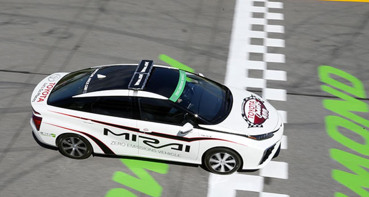 L’intitulé exact de l’épreuve en question est la Toyota Owners 400. C’est la course « maison » de Toyota en Sprint Cup et le constructeur y a plus d’influence qu’ailleurs, mais il a tout de même fallu que la Mirai effectue un test pour vérifier qu’elle est bien conforme aux critères nécessaires pour mener la meute des 43 gros V8 qui vont gronder derrière elle. Le test a été réussi, et la Mirai va donc être la première voiture à pile à combustible vue sur un oval de la Sprint Cup.