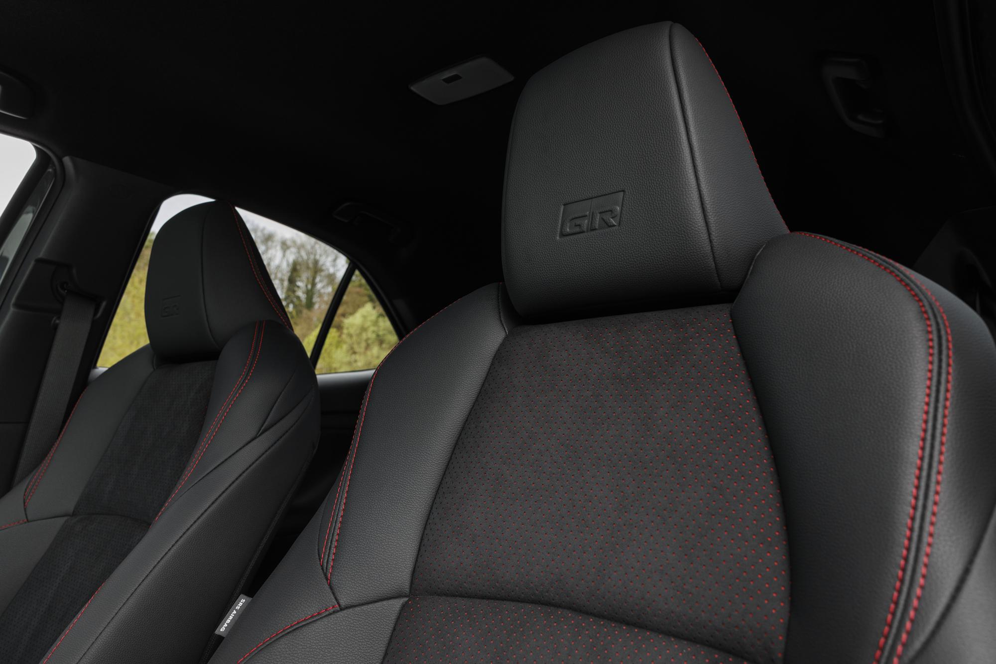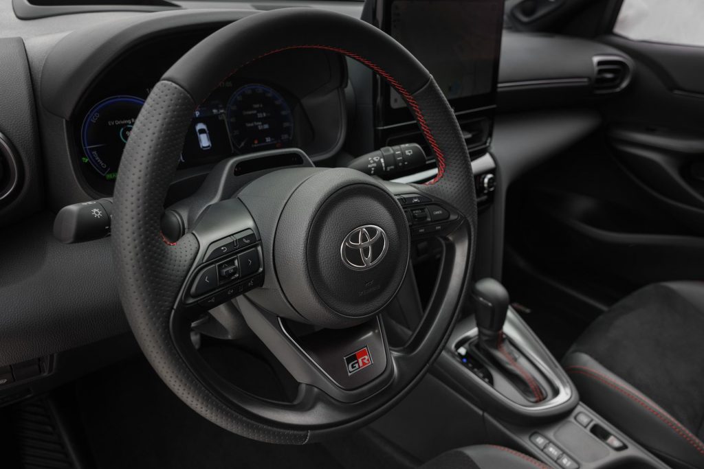 À l’intérieur, des sièges sport spécifiques avec sellerie en suédine grise et surpiqûres rouges sont installés. Des logos GR ornent les appuie-têtes et le volant, tandis que des inserts anthracite habillent les contre-portes et le combiné d’instruments.
