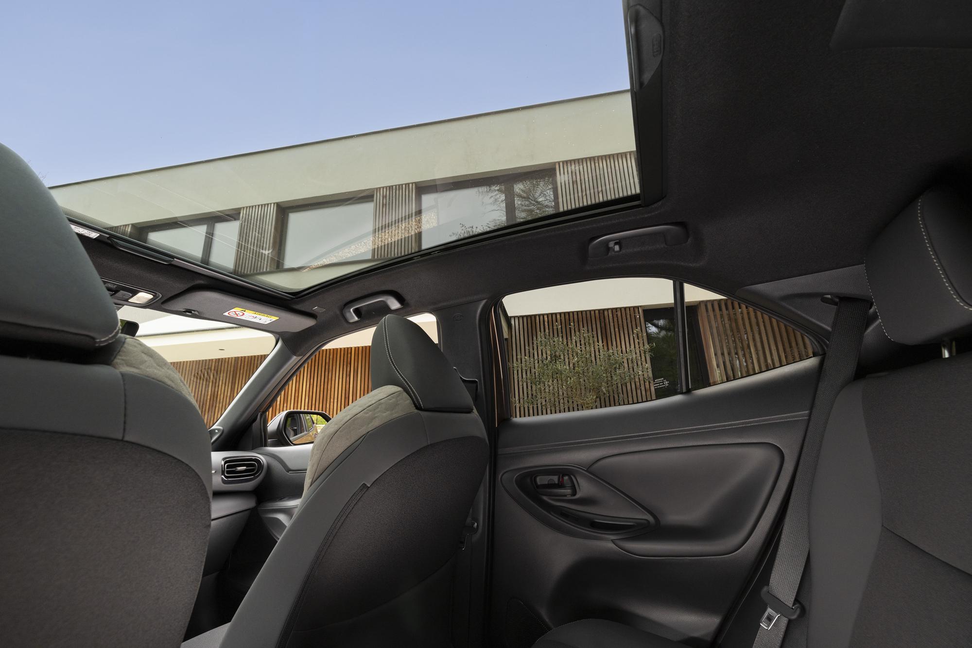 La banquette arrière peut accueillir trois passagers et se rabattre en trois parties (40:20:40) selon les finitions. Les systèmes de sécurité Toyota T-Mate et Toyota Safety Sense sont inclus, avec une assistance au freinage en stationnement de série. Les finitions Trail et GR SPORT ajoutent la surveillance des angles morts.