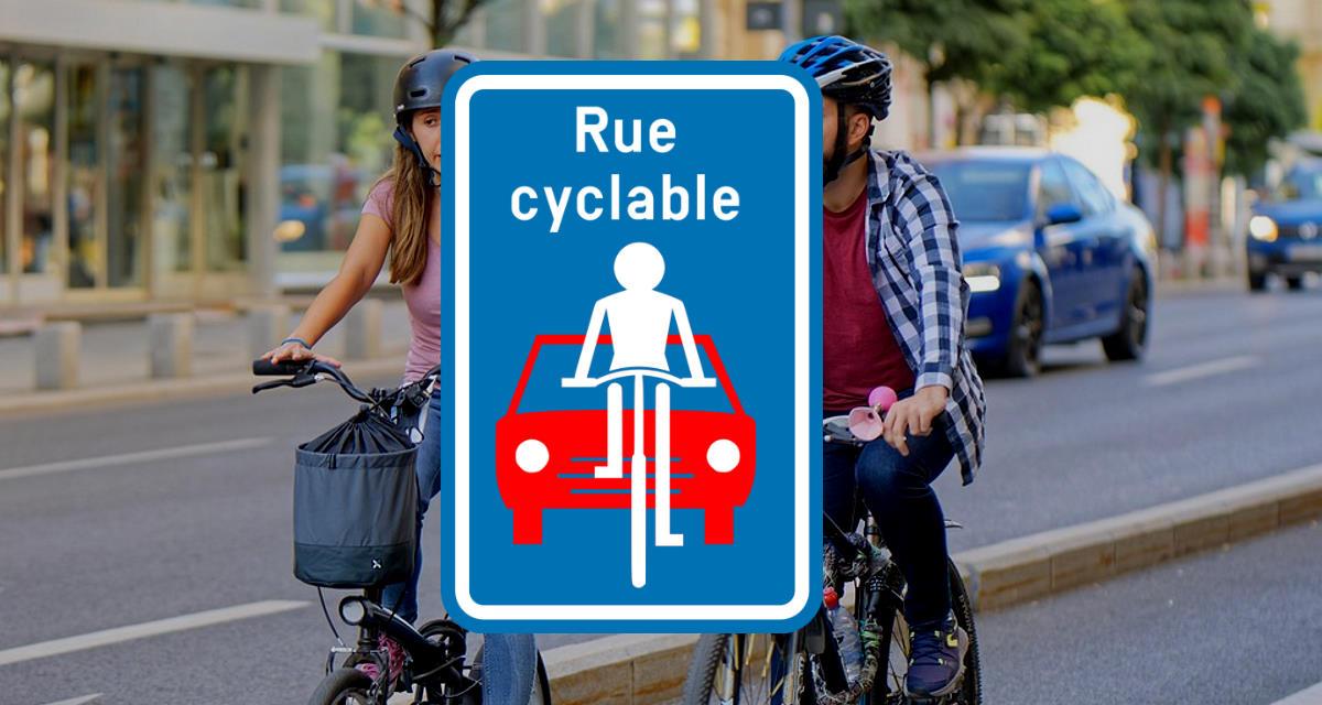 Il s'agit de rue où la priorité est donnée aux cyclistes. Les vélos ne peuvent PAS être dépassés et les automobilistes doivent patienter derrière le cycliste. La rue n'est pas interdite aux véhicules motorisés, mais un peu comme les rues piétonnisées, on inverse les priorités. Les automobiles et autres motorisés sont obligés de fait de réduire leur vitesse à moins de 25 km/h bien souvent.