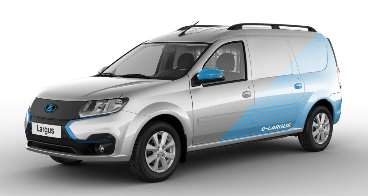 La Largus est un break à bas coût, soeur presque jumelle de la Dacia Logan MCV. Le "concept" électrique a été présenté directement à l'usine d'Izhevsk. Cette e-Largus est pour l'instant une vue "mal photoshopée" (les stries bleues sont droites), ainsi qu'un véhicule découpé pour présenter la motorisation électrique.