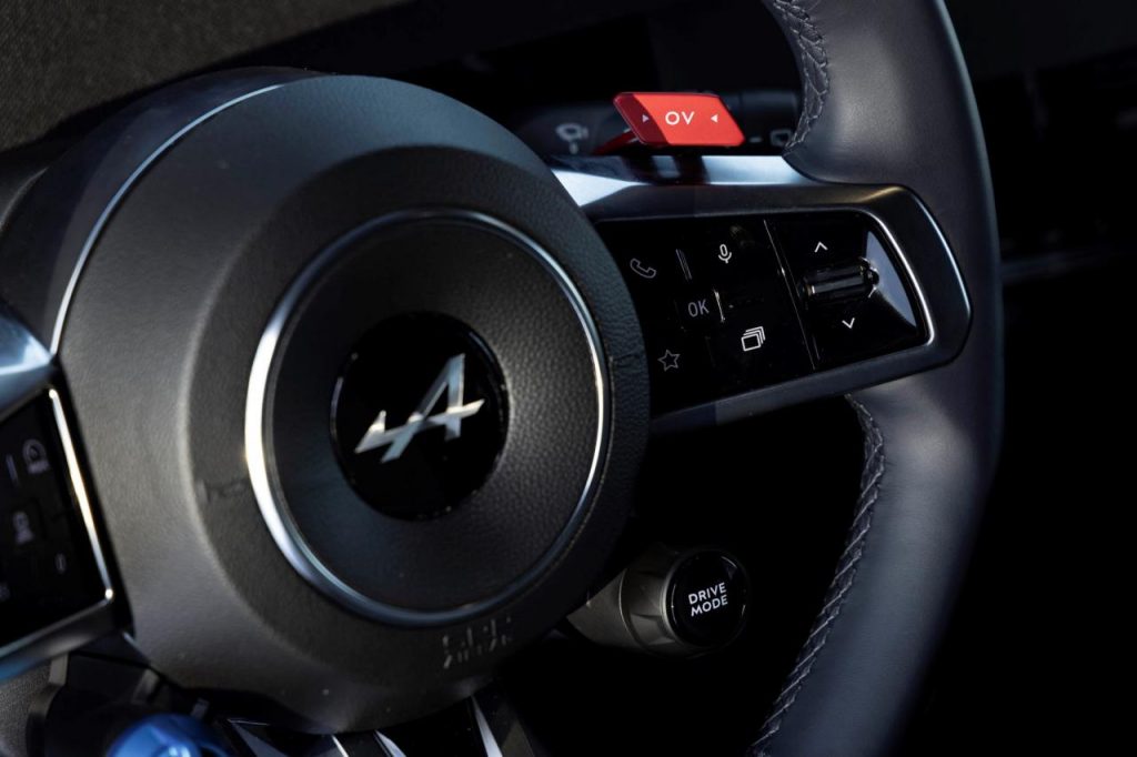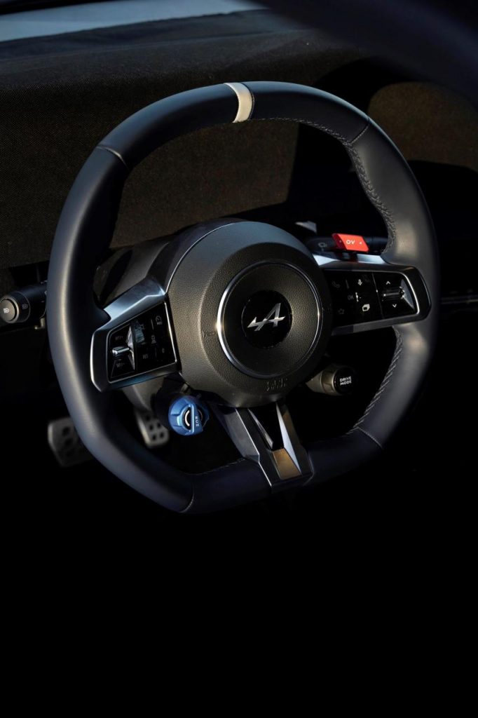 Alpine assure que l'on a là le prototype dans sa version définitive : longueur 3 990 mm, largeur 1 820 mm, hauteur 1 520 mm, empattement 2 530 mm. Des dimensions un peu plus imposantes que celles attendues de la Renault 5 E-Tech. Petite déception sans doute pour ceux qui y ont cru en voyant le concept A290Béta, ce sera une 5 portes. Si la voiture est encore camouflée, le volant, pour sa part, se montre sans artifice. Ce sera celui de production avec trois fonctions qui font très course : OV (Overtake), RCH (Recharge) et Drive modes.