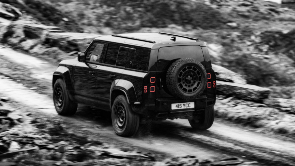 Pour ceux qui veulent pousser le concept encore plus loin, Land Rover recommande le Narvik Black, considéré comme « le noir le plus pur de la palette du Defender ». Ce coloris peut être renforcé par l’ajout d’un film protecteur mat, qui renforce le caractère du véhicule tout en protégeant la carrosserie contre les rayures et impacts. Même les plaques de protection, le bouclier avant, les crochets de remorquage et les quatre sorties d’échappement arborent des finitions noires satinées ou brillantes.