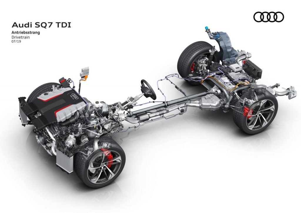 Côté technique, pas de changement. Le SQ7 est décliné en diesel chez nous. Le 4.0 TDI est toujours de la partie. C’est un diesel V8 bi-turbo avec compresseur électrique (et alterno-démarreur 48 V). 435 chevaux de puissance et 900 Nm de couple entre 1 250 et 3 250 tours/min. Ca ne donne pas dans les envolées lyriques. Néanmoins, le 0 à 100 km/h est fait en 4,8 secondes malgré un poids conséquent (2 345 kg à vide).