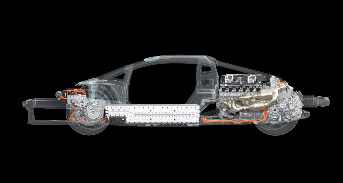 Avec la LB744, Lamborghini propose une toute nouvelle architecture avec un nouveau groupe motopropulseur qui délivre plus de 1000 CV au total. Le moteur V12 atmosphérique de 6,5 litres monté en position centrale est complété par trois moteurs électriques, dont l'un est intégré à la nouvelle boîte de vitesses à double embrayage à huit rapports. Celui-ci est monté transversalement et placé pour la première fois derrière le moteur thermique. Dans ce qui a été le tunnel de transmission depuis l'époque de la Countach, il y a une batterie lithium-ion à la place, qui alimente les moteurs électriques.