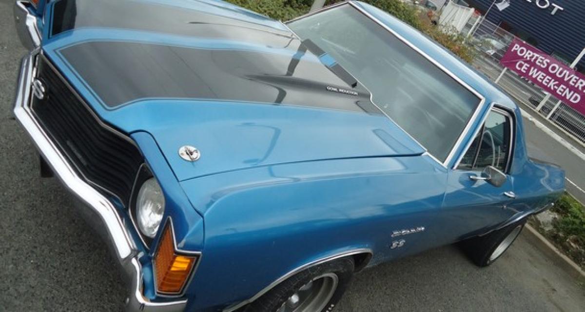 La première El Camino est un flop. Elle revient en 1967, avec un modèle sur base Chevelle. Ici, on peut précisément identifier un modèle 1972 (calandre 2 phares, contre 4 auparavant.) C’est l’époque des muscle cars et les utilitaires n’y échappent pas. Ici, c’est une version SS (Super Sport.) A l’époque, le slogan de Chevrolet est « créez la votre ». D’où un catalogue touffu de moteurs, de boites, de suspensions, etc. Impossible donc d’estimer les caractéristiques. Ce qui est sur, c’est qu’il y a un bon gros V8 sous le capot et qu’il doit bien ronronner… Dire que le pendant français est la 504 pick-up ! On est loin du pick-up à vocation purement utilitaire. Malgré la présence du crochet d’attelage. En plus, cette El Camino a un côté « marlou » et pourtant, elle est presque entièrement d’origine.