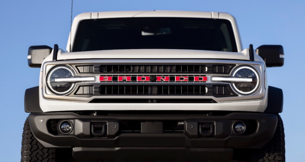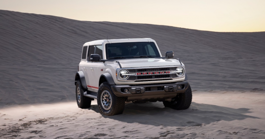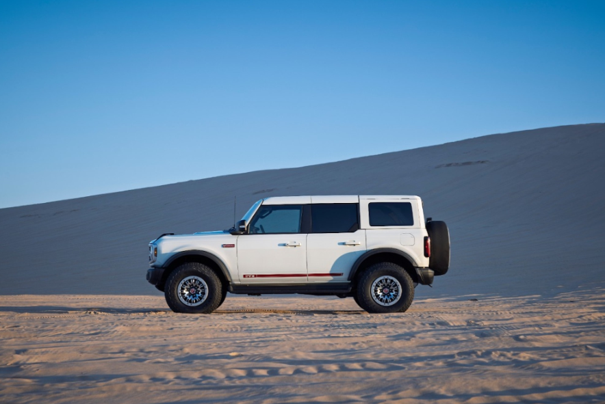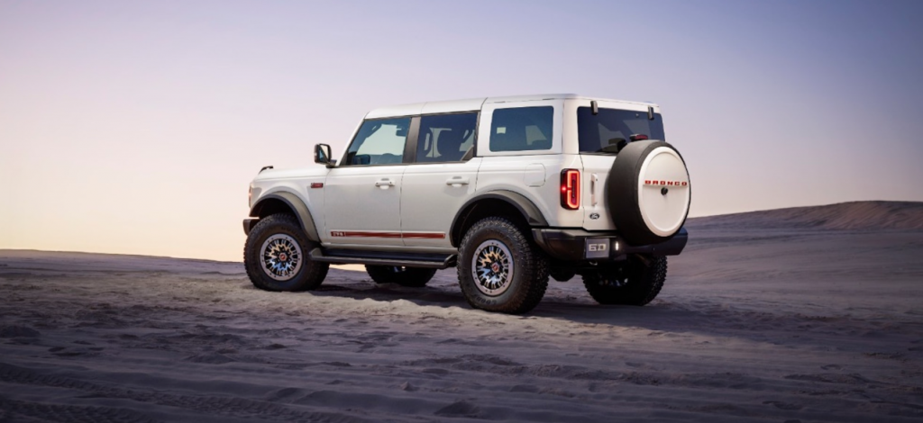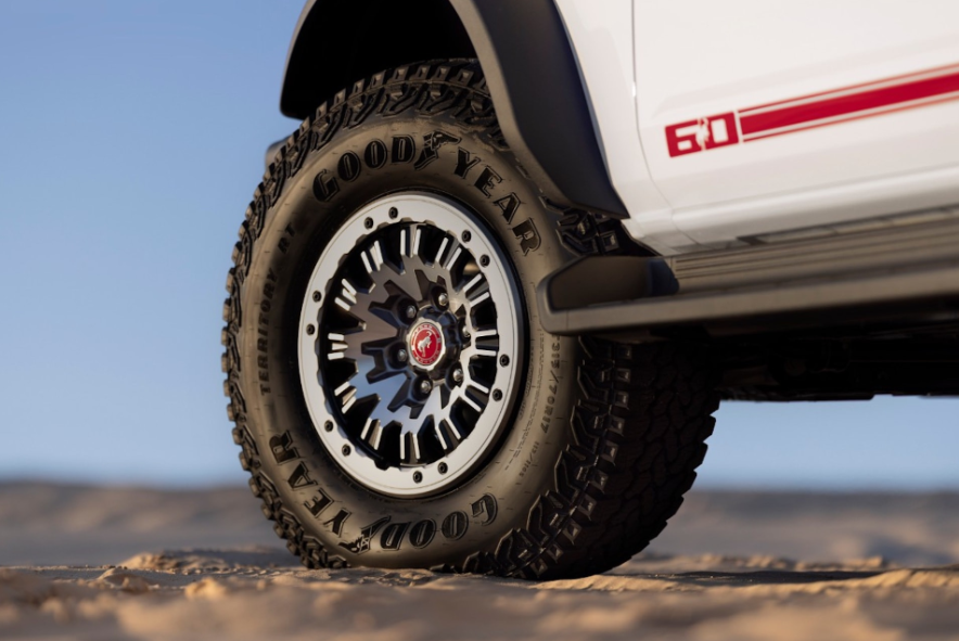 Uniquement disponible avec le pack Sasquatch, cette édition est équipée pour le hors-piste avec un système 4×4 avancé, des différentiels avant et arrière à verrouillage électronique, une suspension rehaussée et des pneus Goodyear de 35 pouces montés sur des jantes Gravity Gray de 17 pouces. Un capuchon central rouge vermillon, orné du logo Bucking Bronco et de l’inscription « 1966 », vient compléter l’hommage visuel.