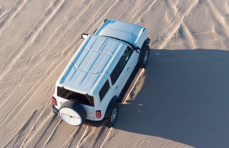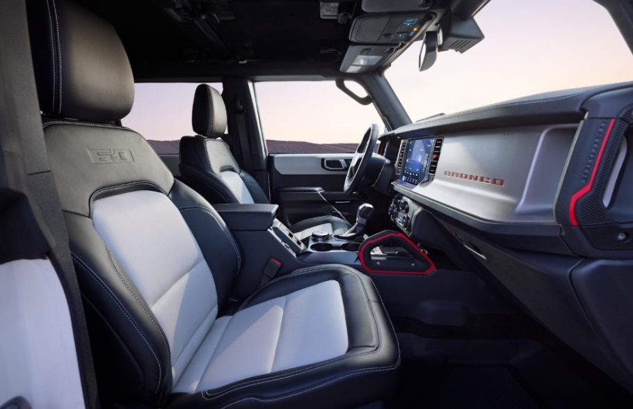Les accoudoirs en vinyle marin assurent durabilité et confort, et les nouvelles poignées de maintien montées sur le montant A font leur apparition sur tous les modèles Bronco 2026. À l’arrière, le couvre-roue central rigide peint en Wimbledon White, accompagné du mot-symbole « BRONCO » en rouge, et un badge Ford noir mat donnent une touche plus haut de gamme à l’arrière du véhicule.