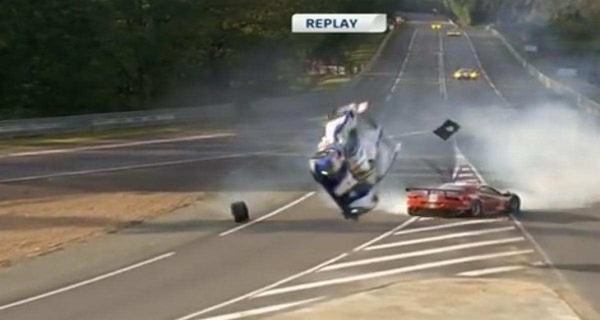 L’accrochage est inévitable et la Toyota privée d’appuis part dans une impressionnante série de tonneaux avant de terminer sa course contre le rail de sécurité. La Ferrari tape également très fort contre le mur de pneus mais aux dernières nouvelles les deux pilotes s’en sortent bien. Anthony Davidson a toutefois indiqué qu’il souffrait du dos.