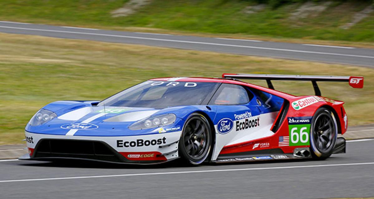 C’est Bill Ford lui-même, en déplacement dans la Sarthe pour donner le départ de l’épreuve samedi, qui a dévoilé en images la voiture de course et l’ambitieux programme. Car Ford ne se contentera pas des 24 heures. Dès 2016, le constructeur engagera deux voitures en WEC et deux voitures en Tudor USC, sous la bannière du Chip Ganassi Racing with Felix Sabates (CGRFS), les quatre autos étant présentes aux 24 heures 2016.