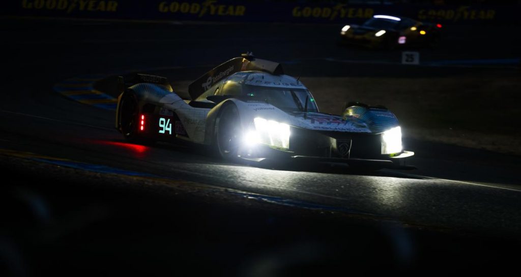 Aux abords de minuit, Peugeot pointe en tête à la surprise générale avec la n°94 pilotée de main de maître par Nico Müller.. En 2e position se trouve la Ferraride Nicklas Nielsen à plus d’une minute, mais avec 1 arrêt supplémentaire. Kamui Kobayashi suit sur la Toyota à la 3e place, et la Cadillac n°2 d’Earl Bamber reste dans le tour de tête. La 2e Ferrari de Pier Guidi est 5e, devant la seconde Toyota, la Cadillac de Bourdais et les deux Porsche restantes qui sont néanmoins à 1 tour.Le clan Porsche, qui a perdu la n°75 il y a quelques minutes, est le grand perdant de ce début de course. Quant à la seconde Peugeot, elle pointe 10e à 3 tours, ayant été distancée par la sortie de piste en début de course.